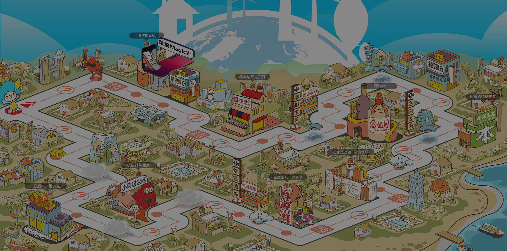 借助年底,用户对“年终总结”“年终奖”的关注,通过小游戏结合问答的形式制作活动H5。 用户进入h5后,即进入一个横版的游戏地图,该地图由不同的天气主题区域组成,阳光明媚区、暴雨区、雾霾区、台风区,不同主题区域设置不同游戏难度。在遇到特殊天气区域(如暴雨区)时会科普相关知识。 用户通过掷骰子获得前进的步数,在前进的路上,不同的地点将触发不同的内容,跟天气有关的题目、奖励、猜气温等。
